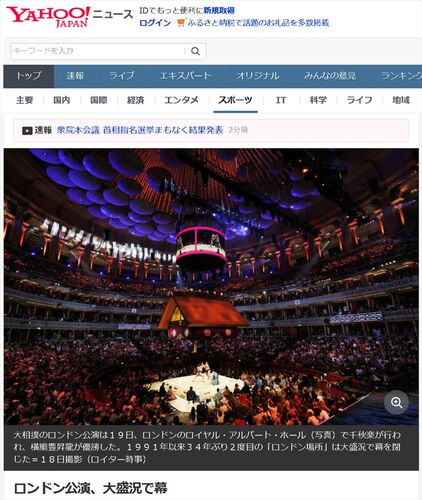 佐久間庸和です。大相撲ロンドン公演が19日、ロンドン中心部のロイヤル・アルバート・ホールで千秋楽が行われ、横綱豊昇龍が優勝しました。ともに4勝無敗で迎えた結びの一番で横綱大の里を送り出しました。約5400人収容の会場には5日間ずっと「満員…