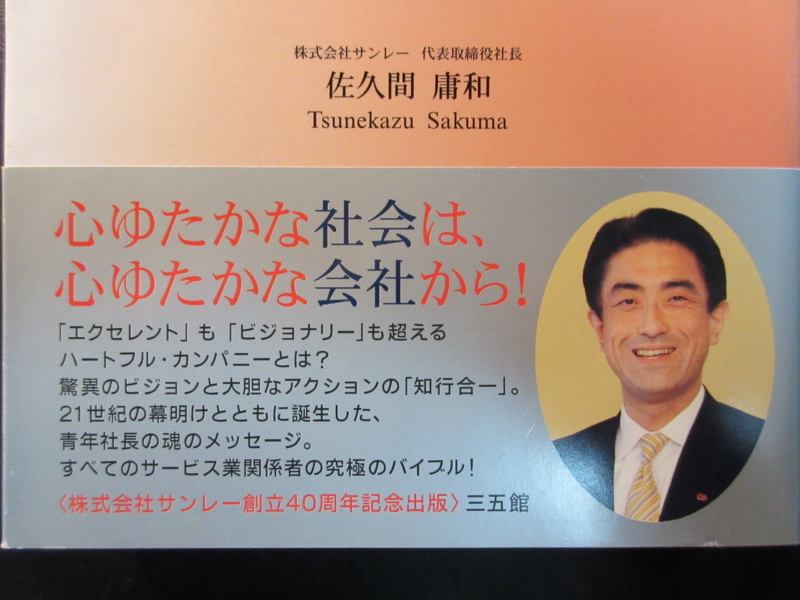 帯には、わたしの顔写真とともに「心ゆたかな社会は、心豊かな会社から!」というキャッチコピーに続いて、「『エクセレント』も『ビジョナリー』も超えるハートフル・カンパニーとは? 驚異のビジョンと大胆なアクションの『知行合一』。21世紀の幕開けとともに誕生した、青年社長の魂のメッセージ。すべてのサービス業関係者の究極のバイブル!」とあり、最後は〈株式会社サンレー創立40周年記念出版〉と記載されています。