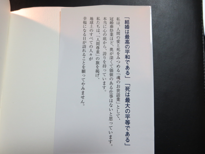 カバー前そでには、「結婚は最高の平和である」と「死は最大の平等である」というわが社の2大テーゼに続いて、「まえがき」で述べたわたしのメッセージの要約が以下のように書かれています。