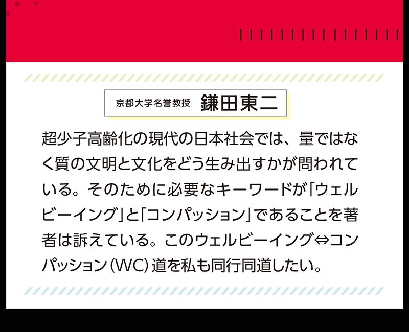 帯の裏には、「京都大学名誉教授 鎌田東二」「超少子高齢化の現代の日本社会では、量ではなく質の文明と文化をどう生み出すかが問われている。そのために必要なキーワードが『ウェルビーイング』と『コンパッション』であることを著者は訴えている。このウェルビーイング⇔コンパッション(WC)道を私も同道したい」とあります。