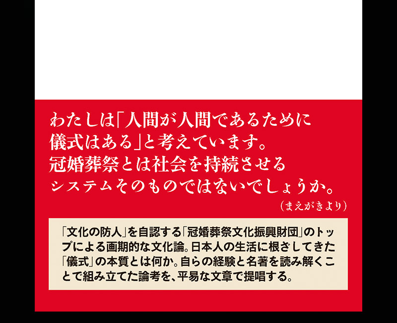 帯の裏には、「わたしは『人間が人間であるために儀式はある』と考えています。冠婚葬祭とは社会を持続させるシステムそのものではないでしょうか。(まえがきより)」「『文化の防人』を自認する『冠婚葬祭文化振興財団』のトップによる画期的な文化論。日本人の生活に根ざしてきた『儀式』の本質とは何か。自らの経験と名著を読み解くことで組み立てた論考を、平易な文章で提唱する」と書かれています。