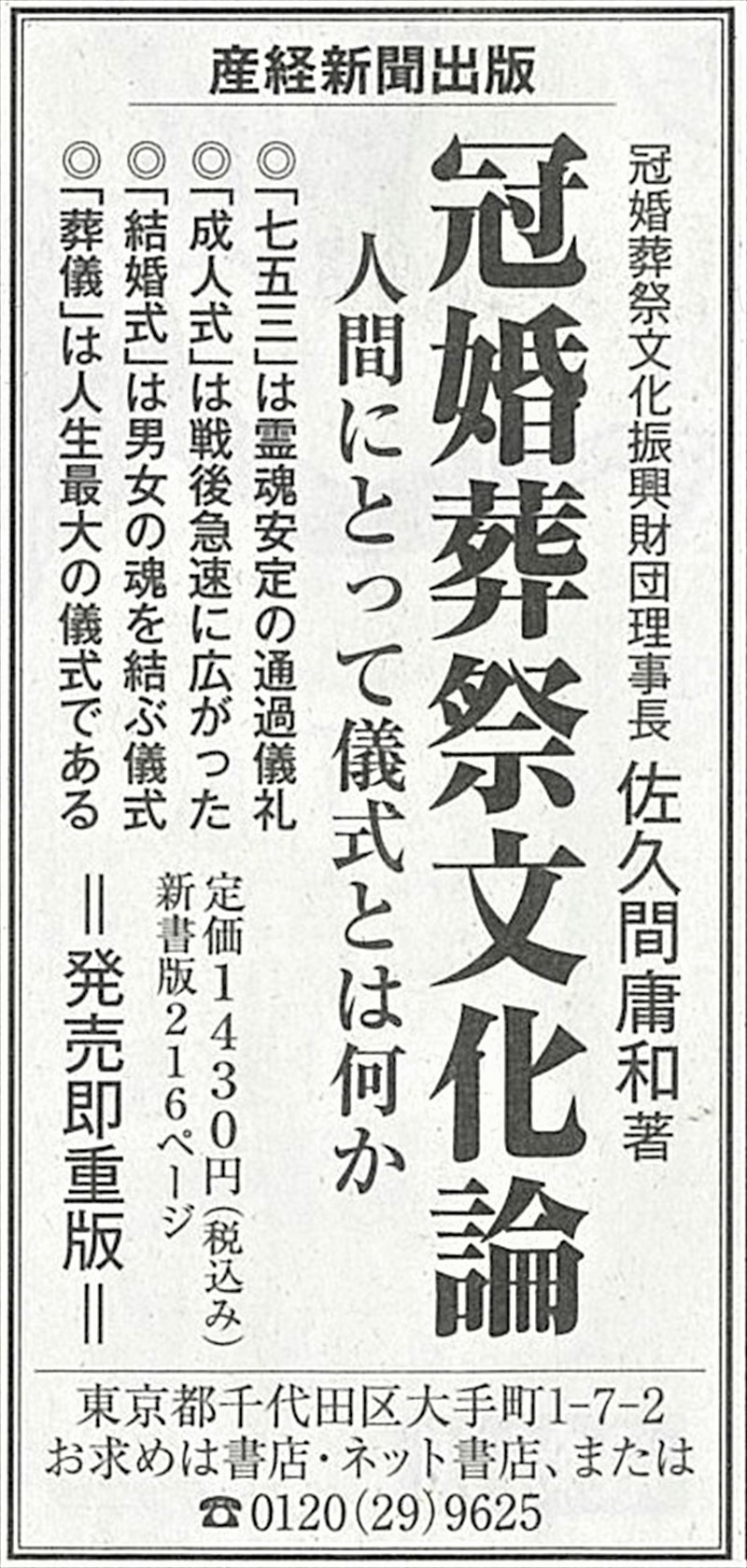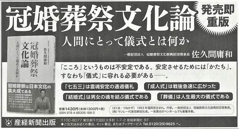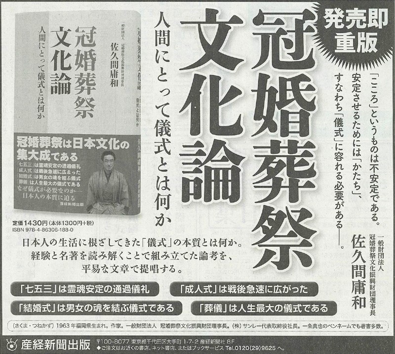 わたしは、これまでに120冊を超える数の本を書いてきました。その多くはペンネーム・一条真也によるものですが、中には本名で書いた本もあります。今回ご紹介する本名本は、『冠婚葬祭文化論』(産経新聞出版)の見本が届きました。サブタイトルは「人間にとって儀式とは何か」。著者名は、一条真也ではなく、一般財団法人 冠婚葬祭文化振興財団理事長の佐久間庸和です。