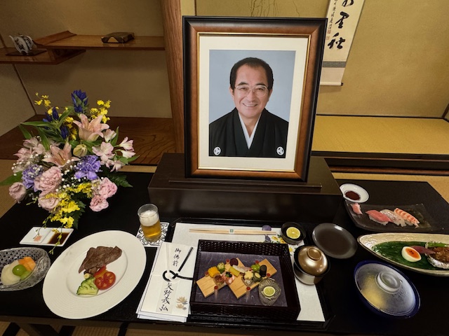 納骨が終わって、すべての儀式が終了すると、松柏園ホテルに移動して「直会」をしました。目を患っていて、ずっとアルコールは控えていましたが、この日は久しぶりにビールを飲みました。やるべきことを果たした後の一杯は旨かったです。父の遺影の前にも影膳でビールの入ったグラスを置きましたが、父は嬉しそうに笑っていました。