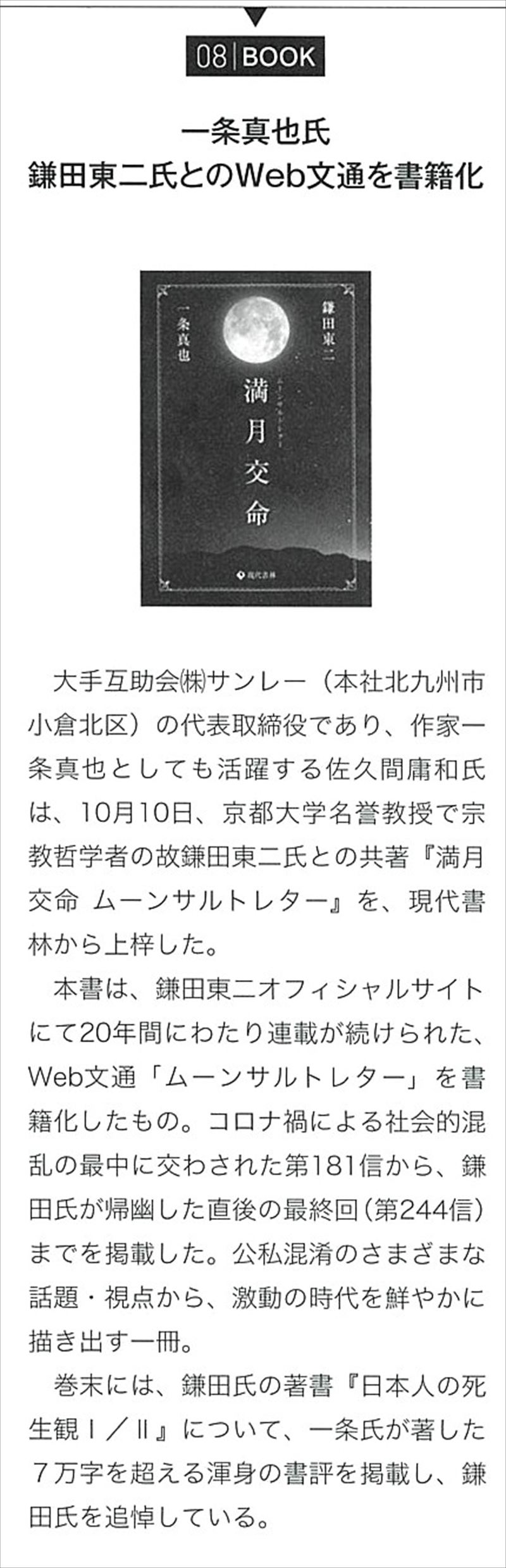 記事は「一条真也氏 鎌田東二氏とのWeb文通を書籍化」のタイトルで、「大手互助会(株)サンレー(本社北九州市小倉北区)の代表取締役であり、作家一条真也としても活躍する佐久間庸和氏は、10月10日、京都大学名誉教授で宗教学者の故鎌田東二氏との共著『満月交命 ムーンサルトレター』を、現代書林から上梓した。本書は、鎌田東二オフィシャルサイトにて20年間にわたり連載が続けられた、Web文通『ムーンサルトレター』を書籍化したもの。コロナ禍による社会的混乱の最中に交わされた第181信から、鎌田氏が帰幽した直後の最終回(第244信)までを掲載した。公私混淆のさまざまな話題・視点から、激動の時代を鮮やかに描き出す一冊。巻末には、鎌田氏の著書『日本人の死生観 I/II』について、一条氏が著した7万字を超える渾身の書評を掲載し、鎌田氏を追悼している」と書かれています。
