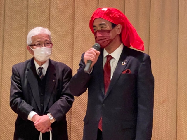 それから、年男&還暦者を祝う時間となりました。小倉ロータリークラブの還暦者には赤いパンツが贈られるという伝統があります。それを履くのではなく、頭巾のように頭に被るのです。この日は2人の女性と1人の男性が対象者でしたが、みなさんベリー・キュートでした! みなさん、本当におめでとうございます! わたしも3年前に還暦を祝われ、頭にパンツを被ったことを思い出しました。