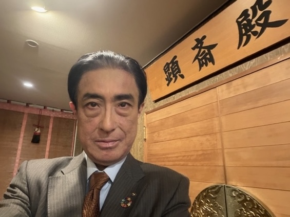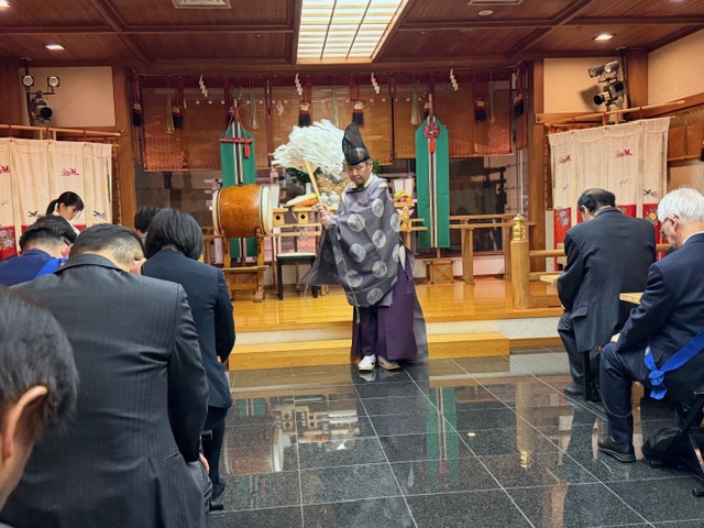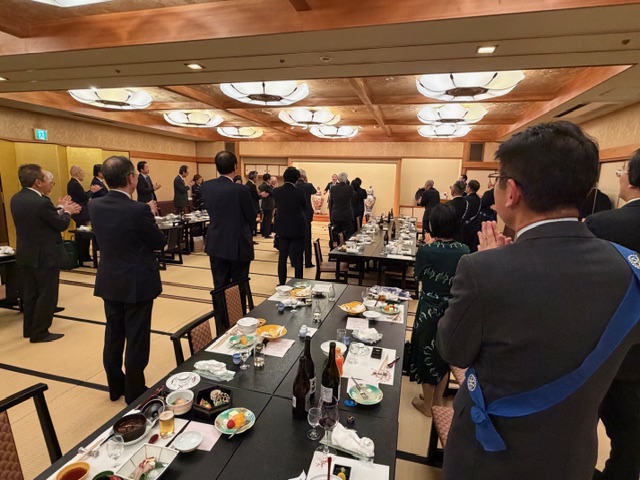 この日は、 松柏園ホテル内の神殿である「顕斎殿」で新年の神事が行われました。昨年5年ぶりに再開した神事です。コロナ禍の間は密を避けるため、バンケットに祭壇を設営して行ったり、昨年は小倉で最も由緒のある八坂神社に場所を移して行ったりしましたが、昨年は本当に久しぶりに松柏園での神事が復活しました。みなさん、「新年初例会は、松柏園でお参りをしてから新年会を開く」というのが慣例になっていたので、ようやく日常が戻ったという安堵の顔をされていました。この日は、高山会長・野嶋副会長・合馬監事のトリオが揃って欠席という異常事態でしたが、山根副幹事が代表者として立派に玉串奉奠を行って下さいました。高市首相ではありませんが、「女性の代表というのは良いなあ!」と思いましたね。