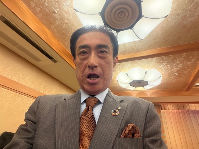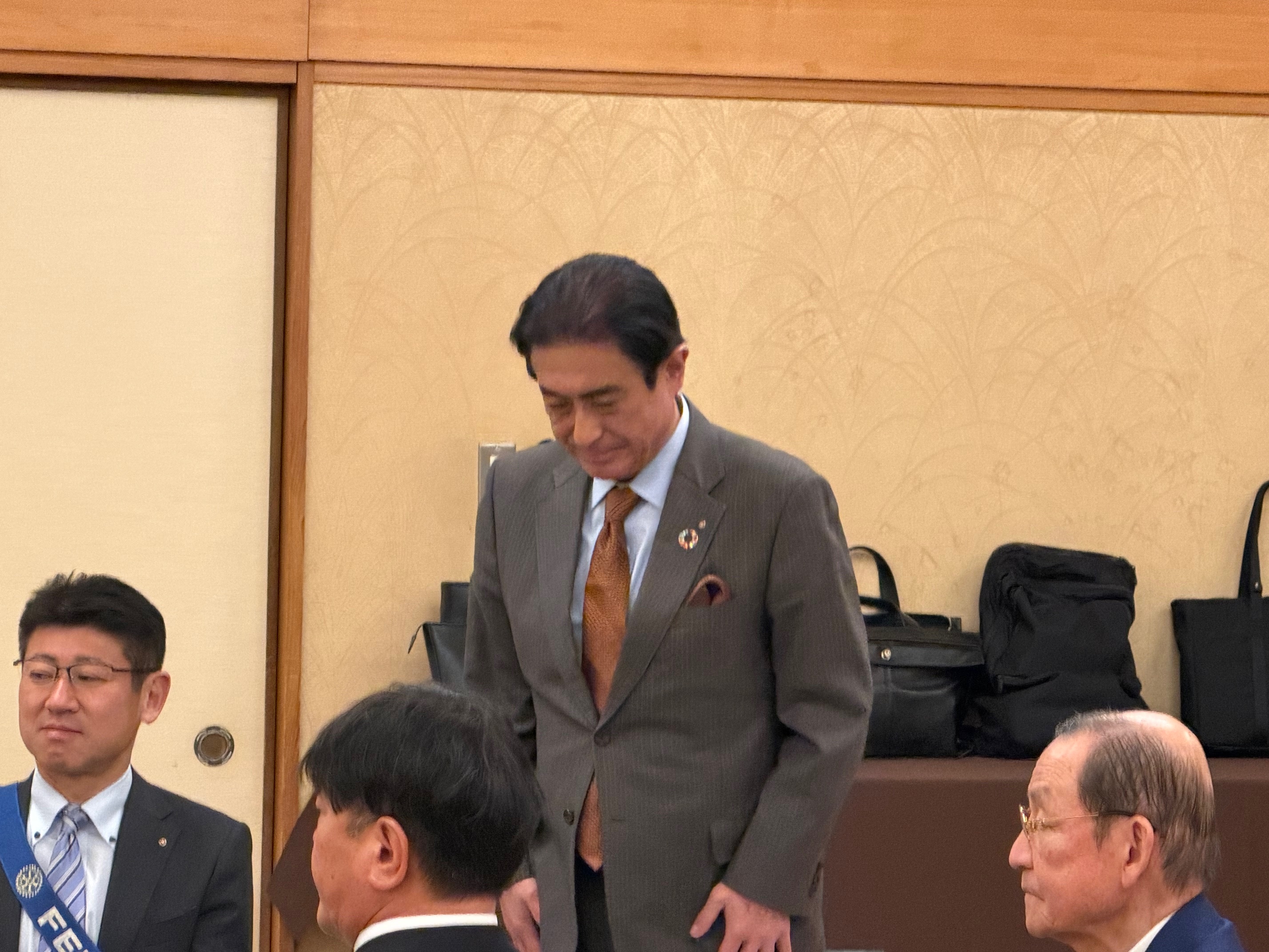 この日の新年夜間初例会は、会場がいつものように大広間で行われました。最初に国歌「君が代」を合唱し、昨年の病気から回復された二村ソングリーダーによる「ロータリーソング」の合唱後は、会長の時間となりました。この日は高山会長が欠席だったため、野嶋副会長が挨拶をしました。野嶋副会長は丙午に関して、個人情報も交えてたっぷり話しました。その後、ニコニコ献金の時間となり、わたしの「あけまして、おめでとうございます。今年も、よろしくお願いいたします。今日は、松柏園ホテルをご利用いただき、ありがとうございます!」とのメッセージが読み上げられました。